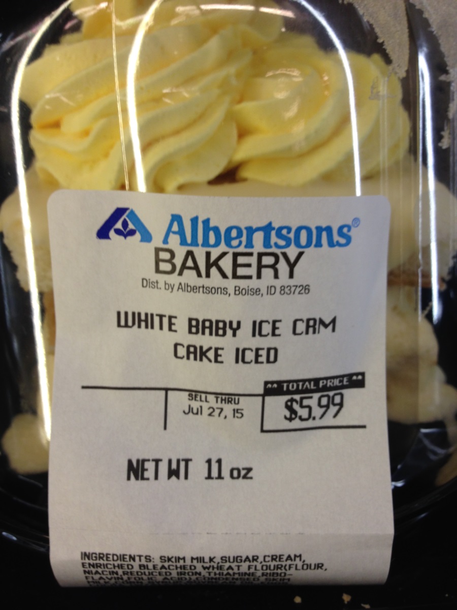 Well, the bakery at Albertsons has got you covered, my friends, and they’ll do you one better. They’ll satisfy your white baby ice cream craving in cake form.